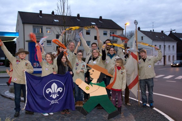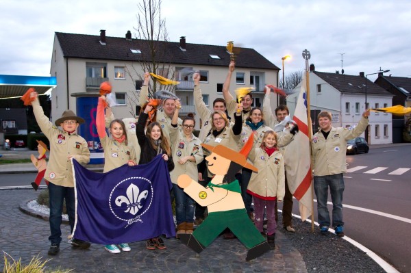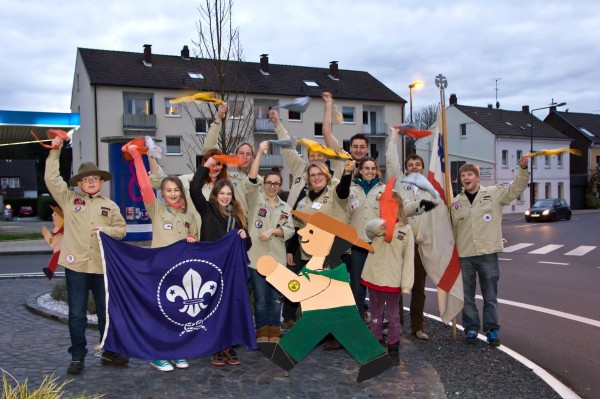 Auch wir haben das dieses Jahr getan und im Kreisverkehr kleine Pfadfinder aufgestellt die die 4 Altersstufen bei der DPSG (Deutsche Pfadfinderschaft St. Georg) darstellen. Orrange sind die Wölflinge, Blau die Jungpfadfinder, Grün die Pfadfinder und Rot die Rover. Alle zusammen ergeben die 4 Alterstufen die die Kinder ab 7 Jahre durch leben können eh sie mit 21 dann Leiter werden.
